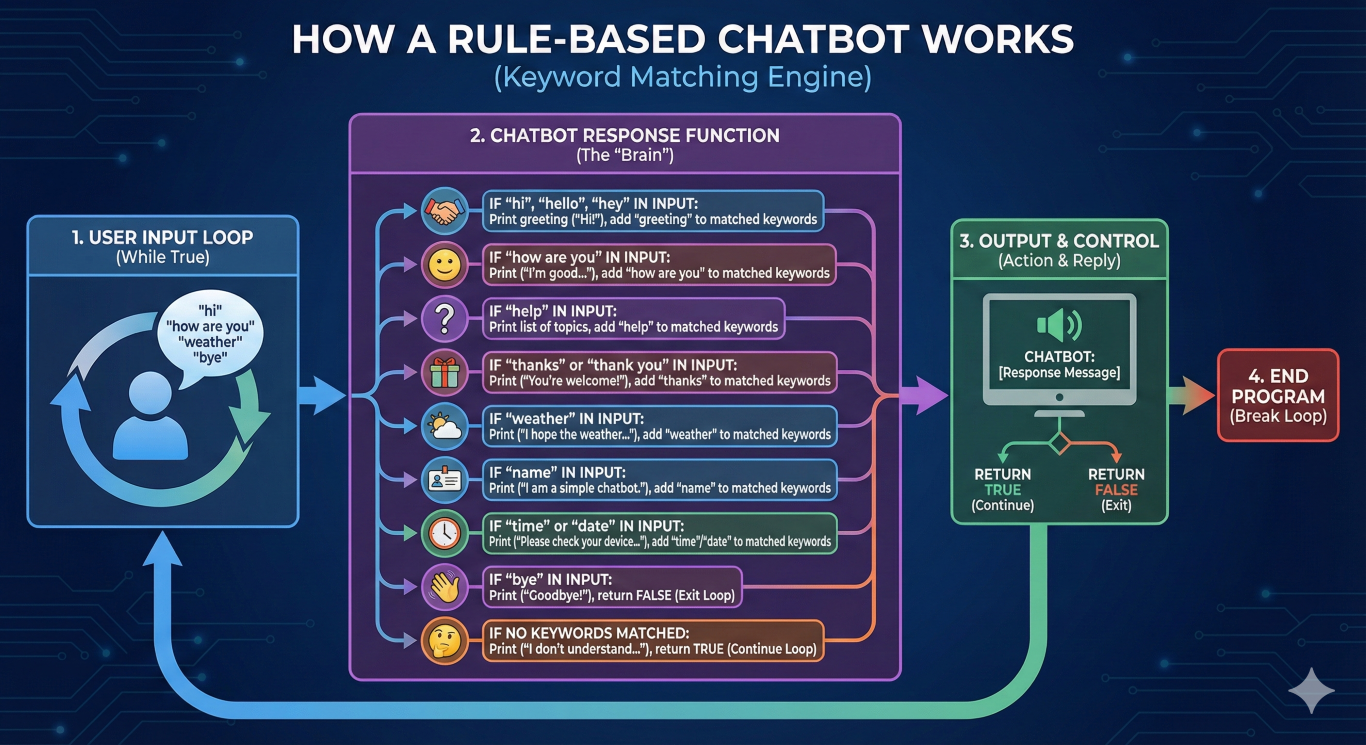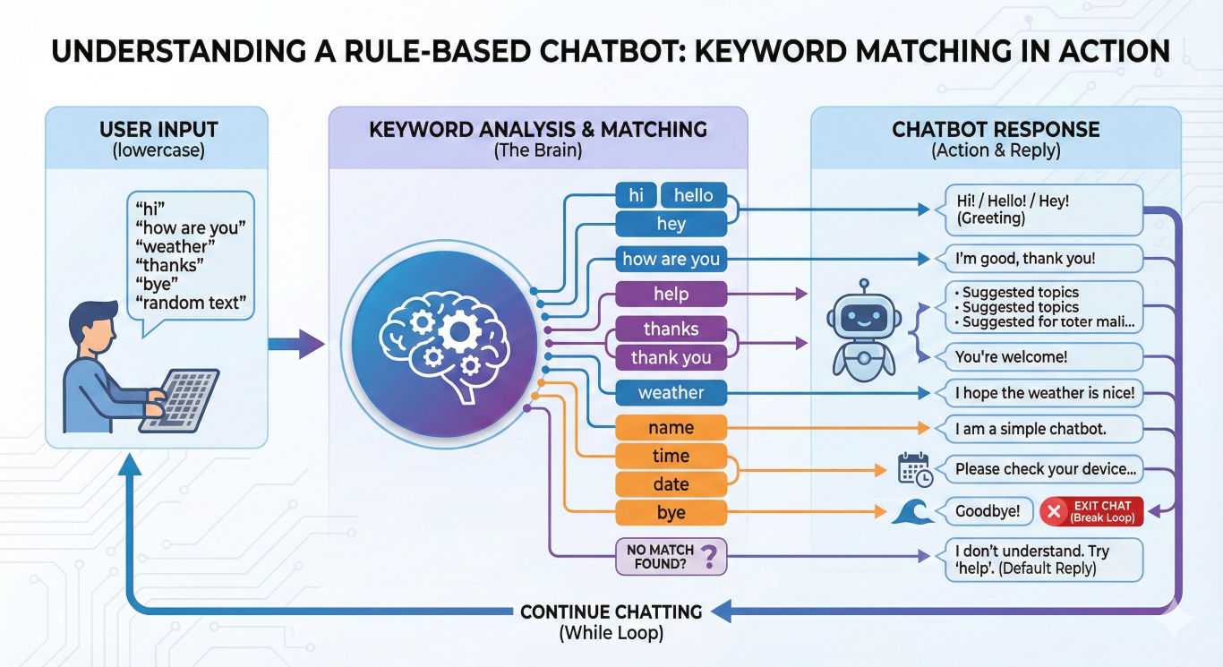 print("Chatbot: Try saying hi, how are you, thanks, weather, name, or bye.")